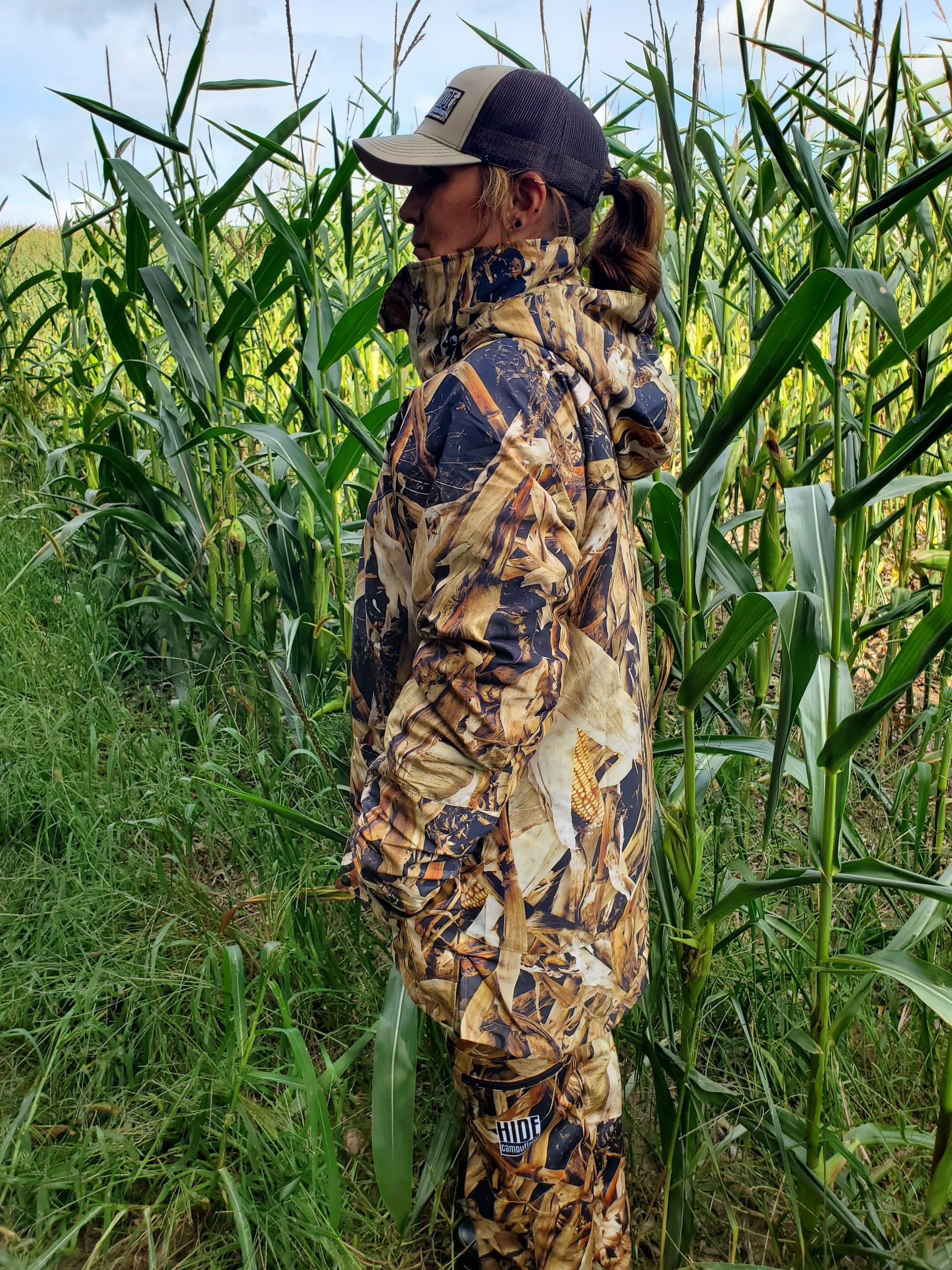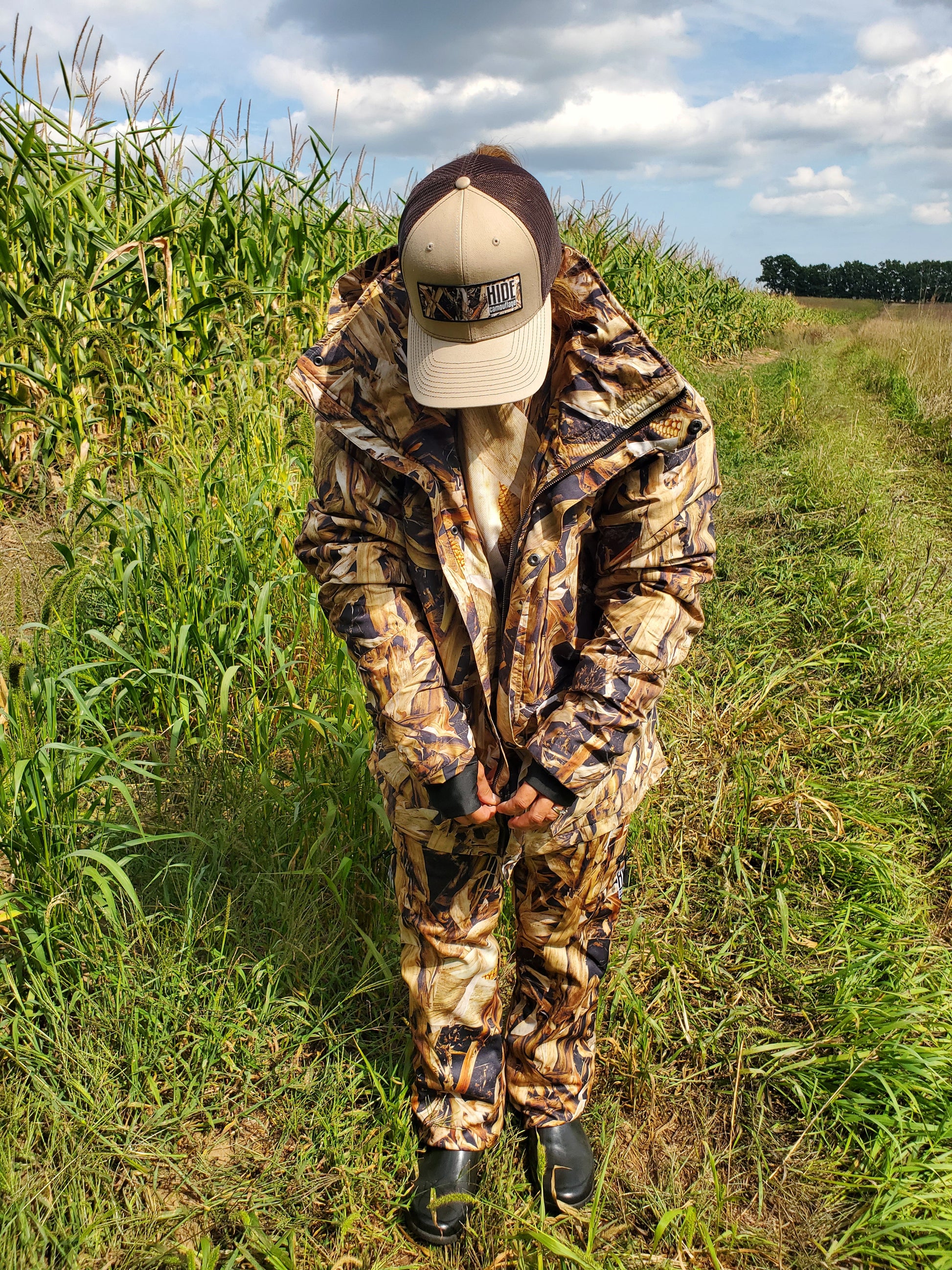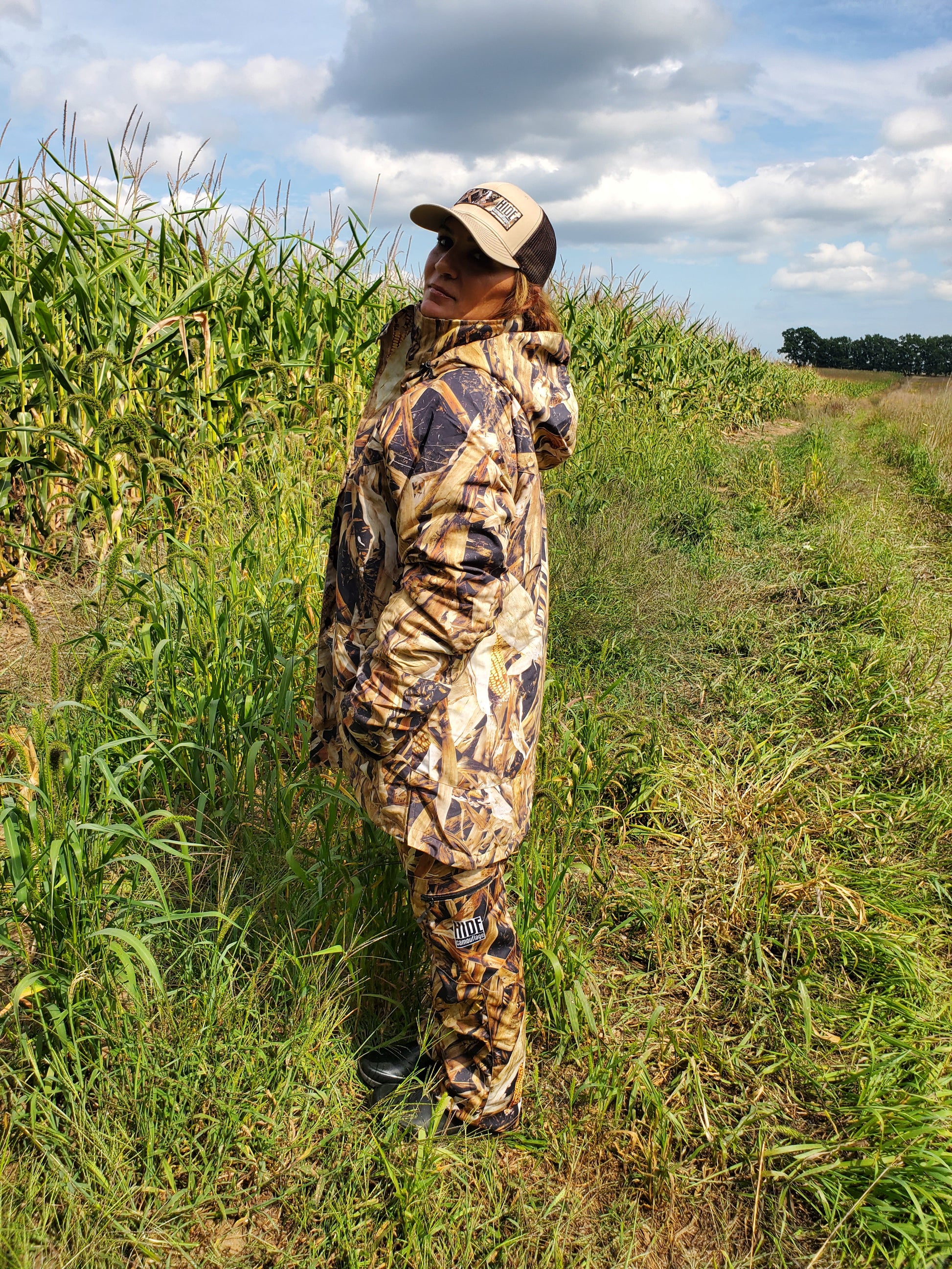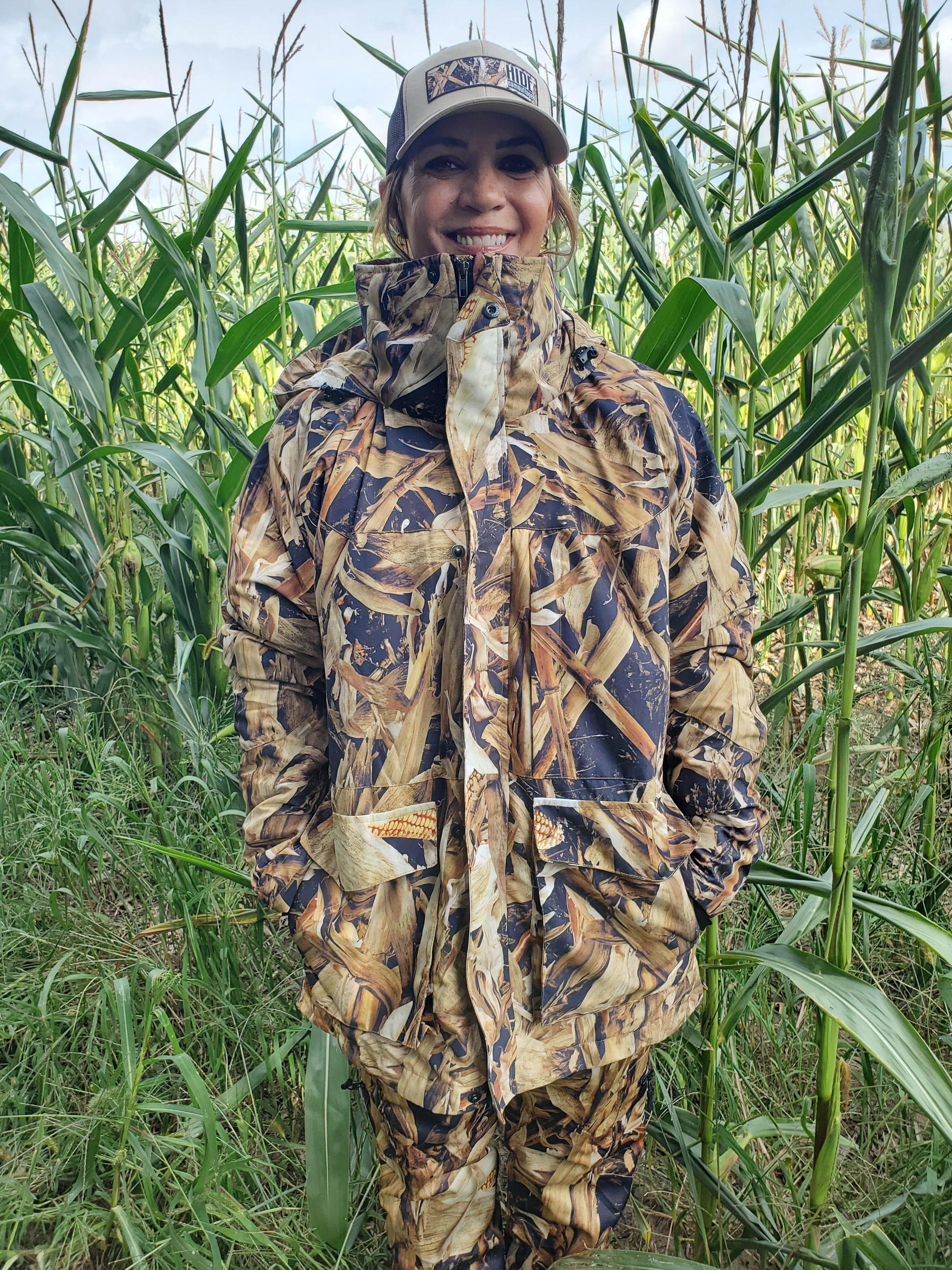 I get many questions about female sizing so during this photo shoot I brought along Mrs. Hide Camouflage to illustrate how our clothing fits the female form. She is 5'4" and wearing a LARGE jacket... I am 5'11' and wearing an XL jacket